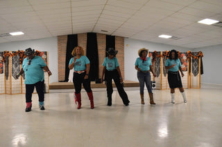 The Sapphire's Jewlz Dance Crew, including Dr. Sapphire, joyfully line dancing together in matching outfits at a class event.